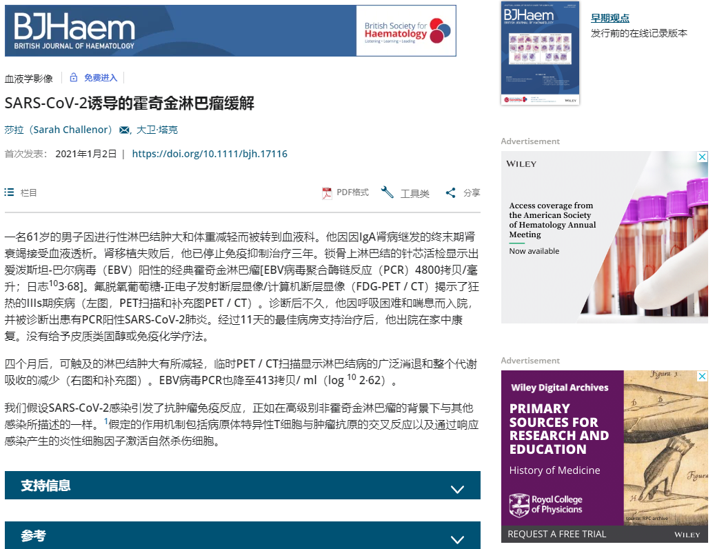 英国《血液学杂志》报道了一个极其罕见的案例,一位61岁的晚期霍奇金淋巴瘤患者不幸感染新冠病毒,4个月后,这位合并有尿毒症的晚期肿瘤病人不仅生命没有受到威胁,复查PET-CT发现体内的肿瘤消失不见了。