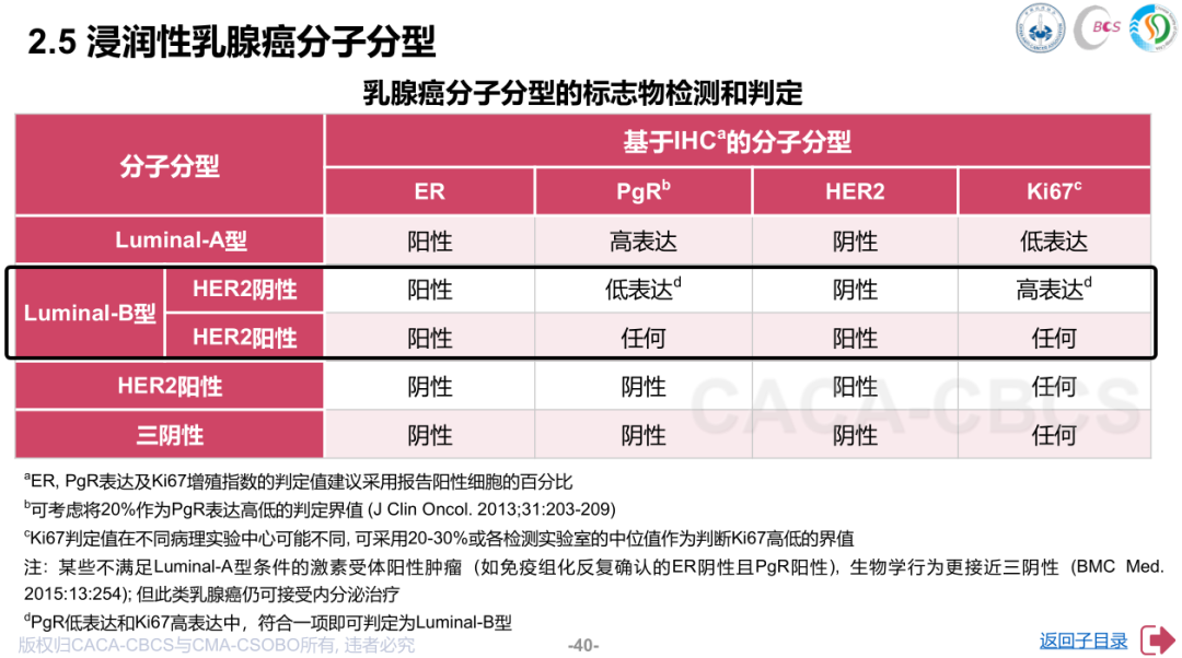乳腺癌的分子分型基于肿瘤细胞中的特定生物标志物,包括雌激素受体(ER)、孕激素受体(PR)、人类表皮生长因子受体2(HER2)及Ki-67增殖指数。