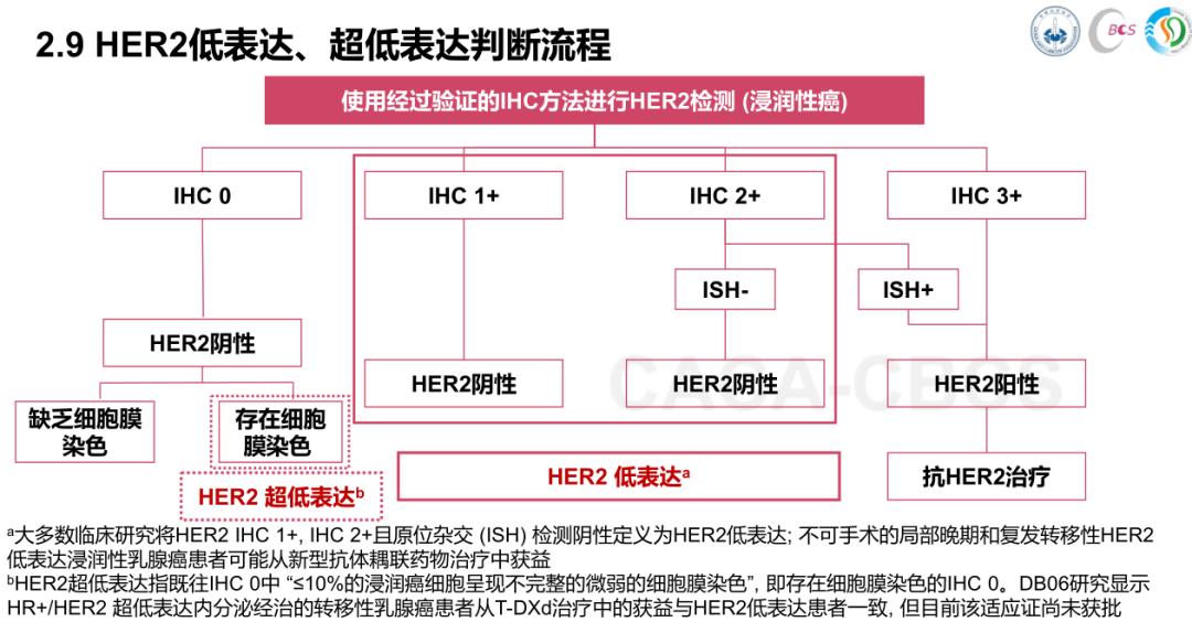 两个指南在分子分型的判定总体是一致的,但在划分上稍有差别。CSCO指南将CBCS指南中Luminal B型 的HER2阳性乳腺癌单独划分出来,但二者均在今年增设了HER2低表达及超低表达的概念,将HER2表达状态进一步细分,更好地指导用药方案。相关文章推荐,《看完这篇后我才知道,原来我的HER2不只是阴性!还有这么多分型......》
