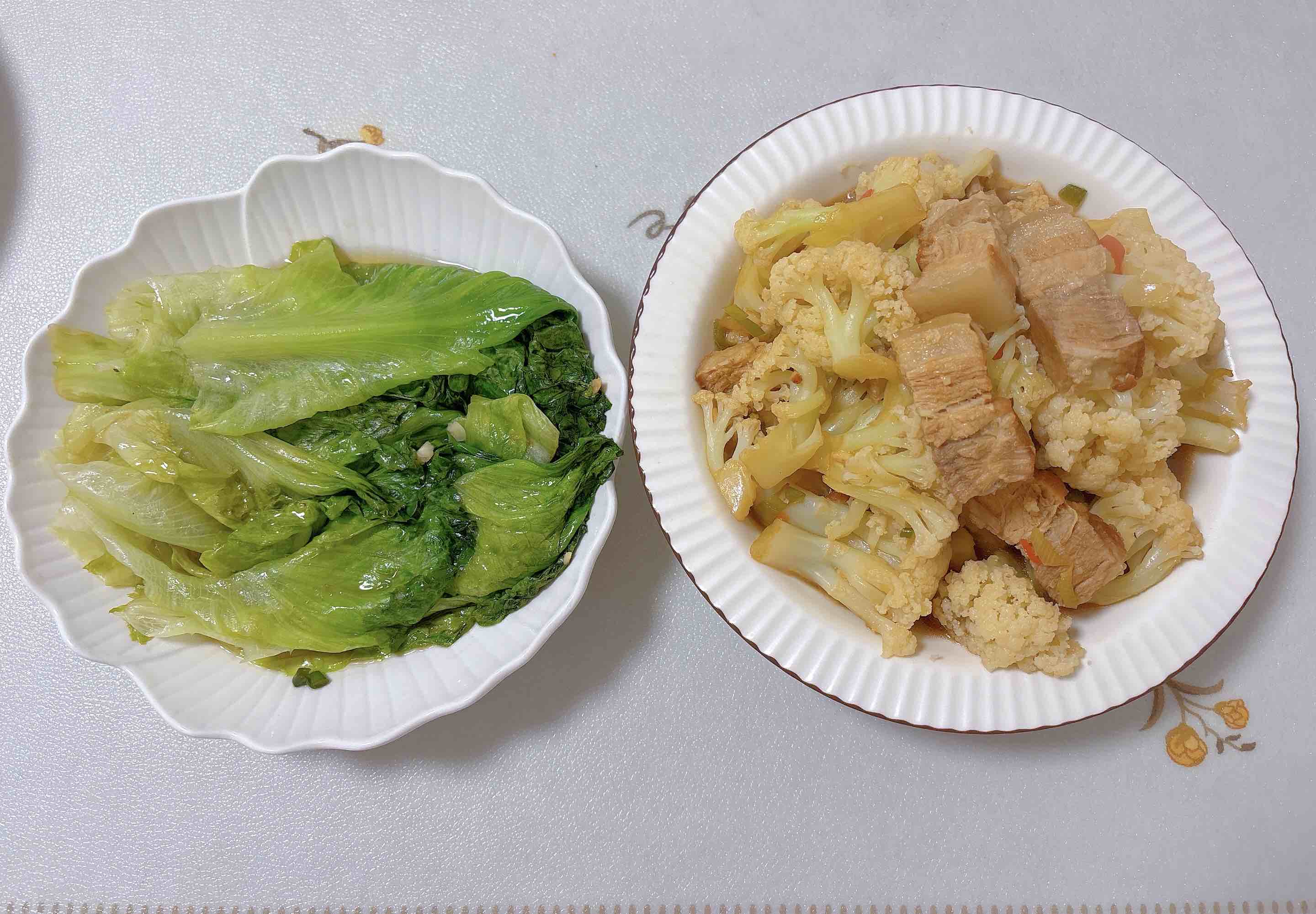 一盘是翠绿鲜嫩的清炒生菜,透着清爽。另一盘是花菜与肉块相融,简单却满是生活的烟火气。