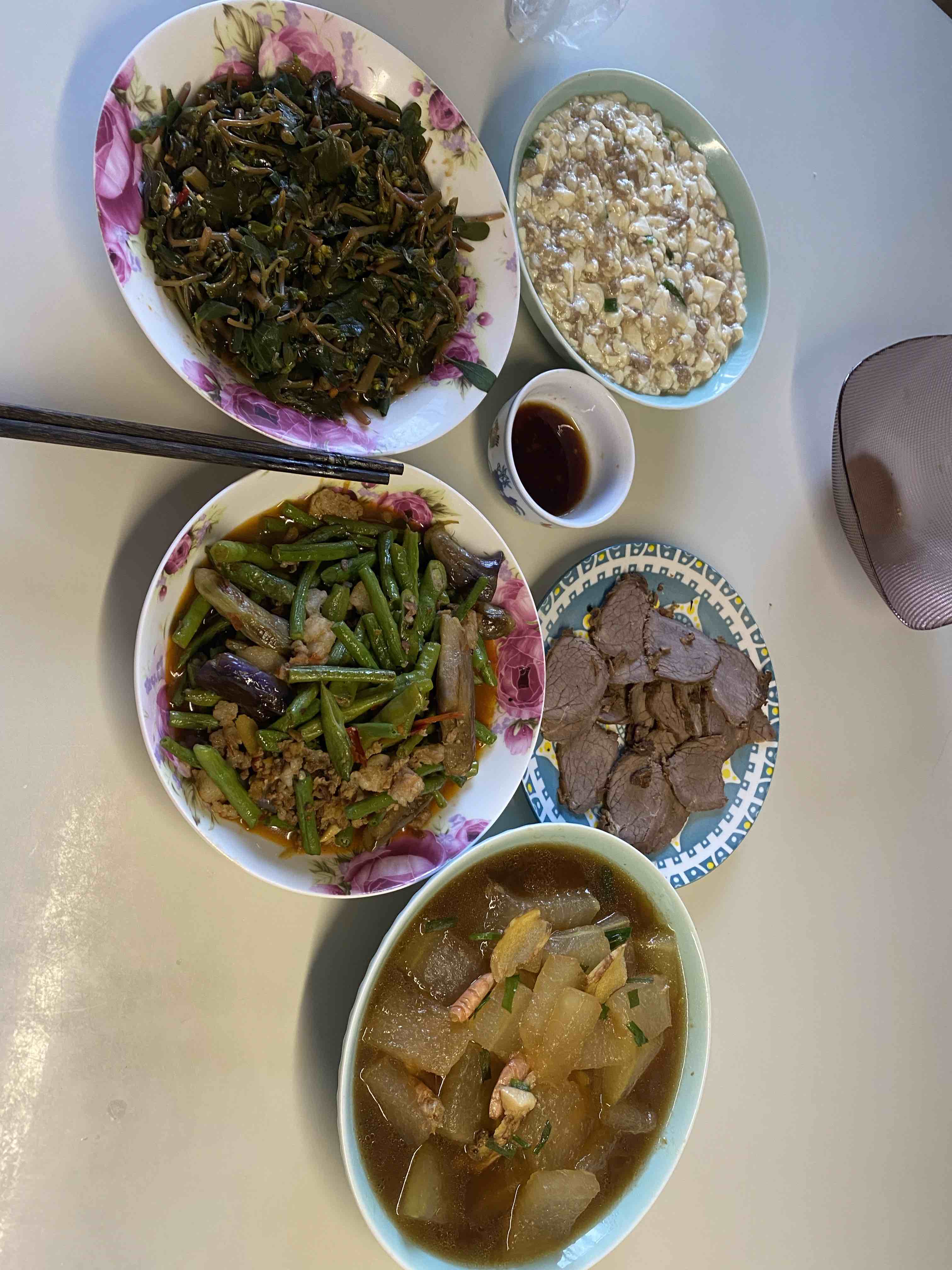 咨询了医生,胆囊炎炎症没了,可以吃牛肉了,但是肥牛等脂肪含量高的不能吃。老公今天卤了牛肉,煮了肉沫豆腐来弥补我的蛋白质,昨天验血总蛋白、白蛋白都低于正常值。但是我还是心有余悸,牛肉只吃了两片,慢慢来吧!