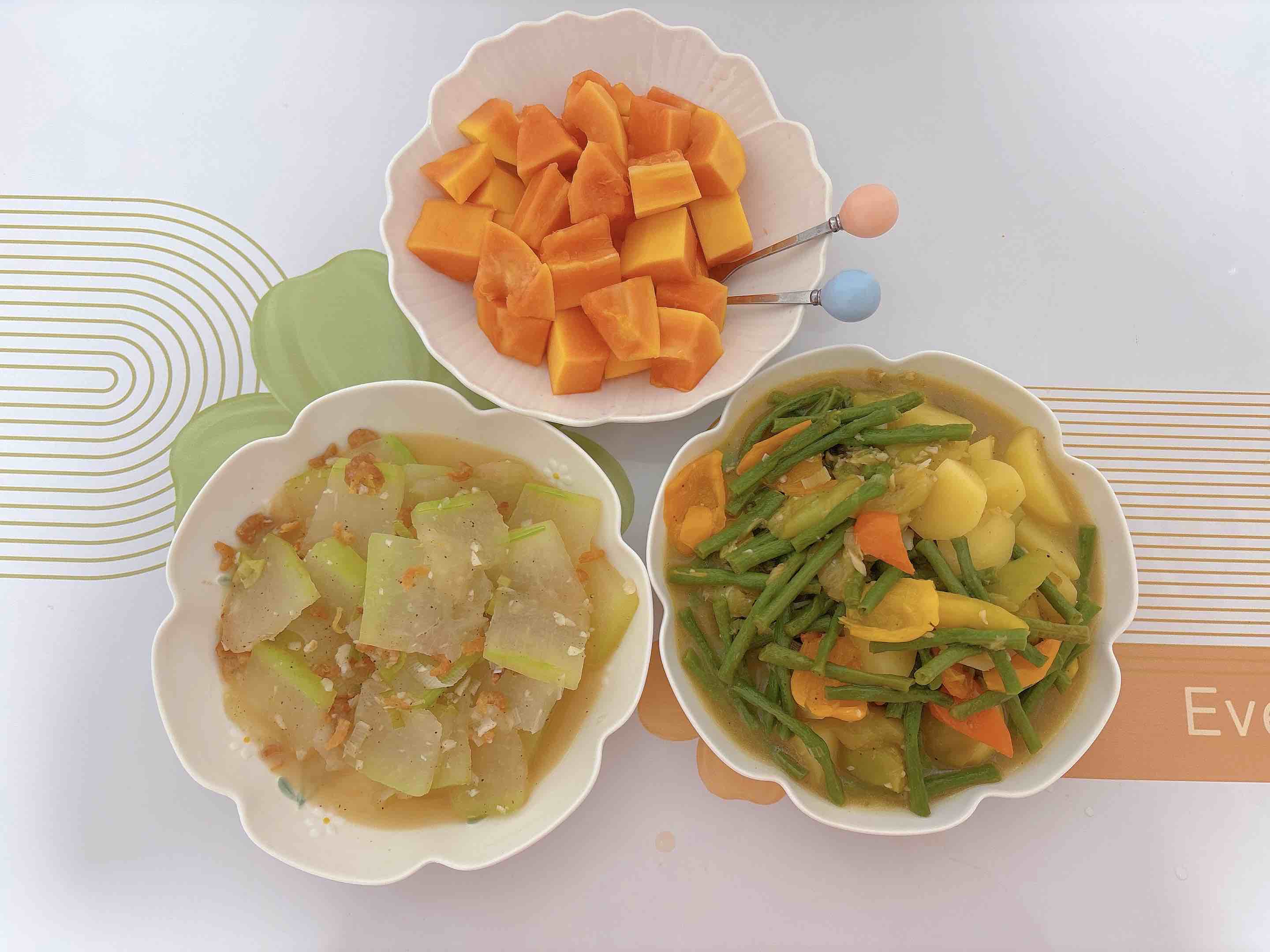 虾米冬瓜,虾米的鲜与冬瓜的嫩融合。土豆茄子彩椒烧豆角,食材软糯入味。木瓜金黄诱人。简单几样,是平凡日子里的烟火幸福。