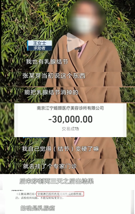 例如,南京的王女士听信了一家医疗美容机构的宣传,对方称通过仪器按摩可以消除乳腺结节。为此,王女士花费30万元,可结节非但没有消除,还被查出患上了乳腺癌。