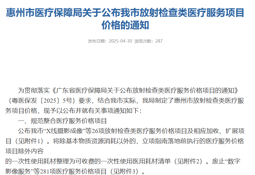 自2025年4月30日起,广东省规范整合了放射检查类医疗服务价格,实行最高限价管理。