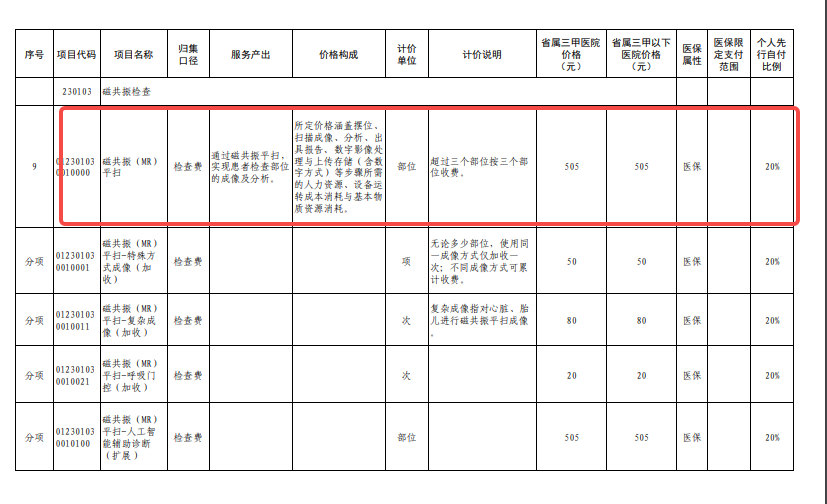至于磁共振(MR)平扫,在省属三甲医院和省属三甲以下医院的收费均为505元,并且该项目属于医保范畴,个人需要先行自付20%的费用。此外,如果检查超过三个部位,则按照三个部位的标准进行收费。