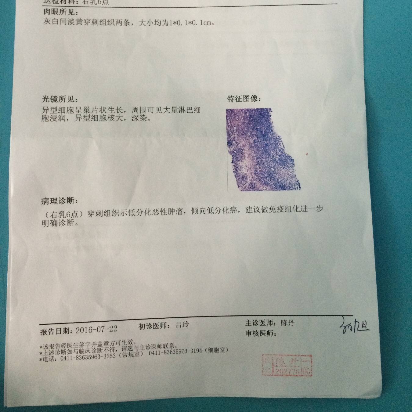 姐妹们!我才29岁宝宝还不到两岁,哺乳了18个月!在今年五月份的时候体检还一切正常、这不到两个月的时间再一次洗澡自检中发现了硬块。去医院做了彩超和B超显示4b和1级!后来又做了活检,显示癌细胞,我真的是不敢相信我自己一向健康的身体会跟这个病联系上!老天能不能不要给我判死刑,我想抚养孩子长大,我想给父母养老送终,我想和老公一起去体会世界生活的美好!姐妹们大家给我鼓励好吗?这是我的穿刺活检结果大家帮我看一看!我现在在等待组化结果准备手术了