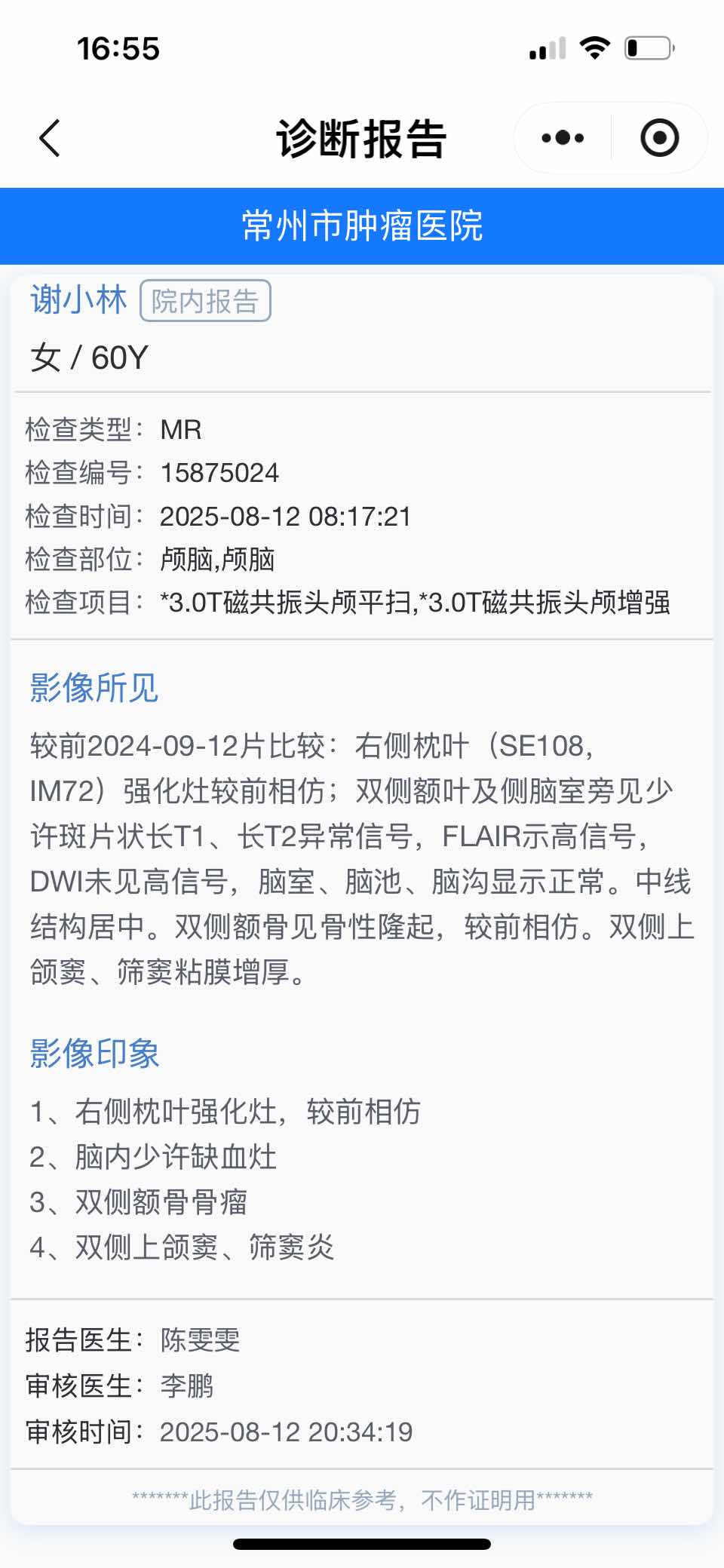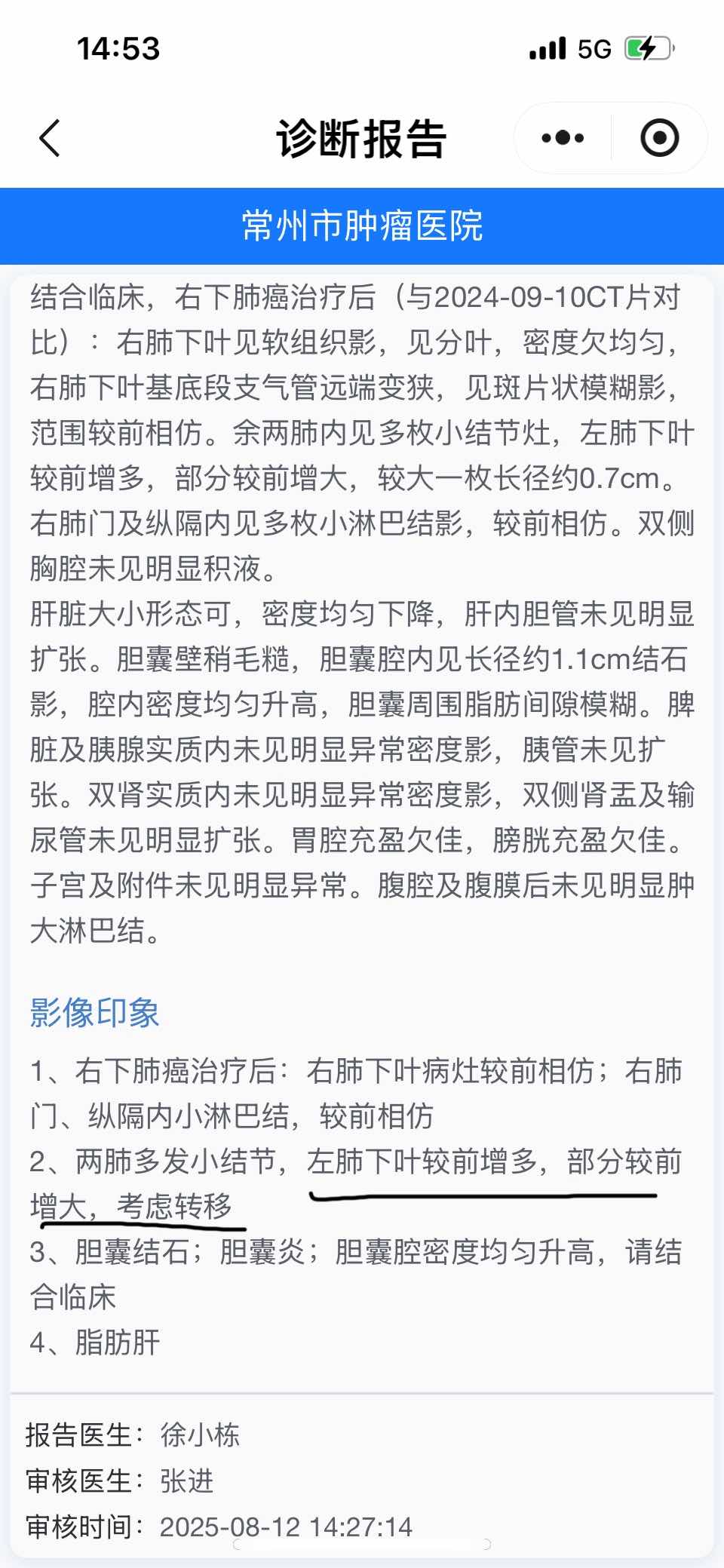 这次的复查发现左肺有转移,另外有小结结增多。脑核磁共振还是维持原状。其它的肿瘤指标都是正常。