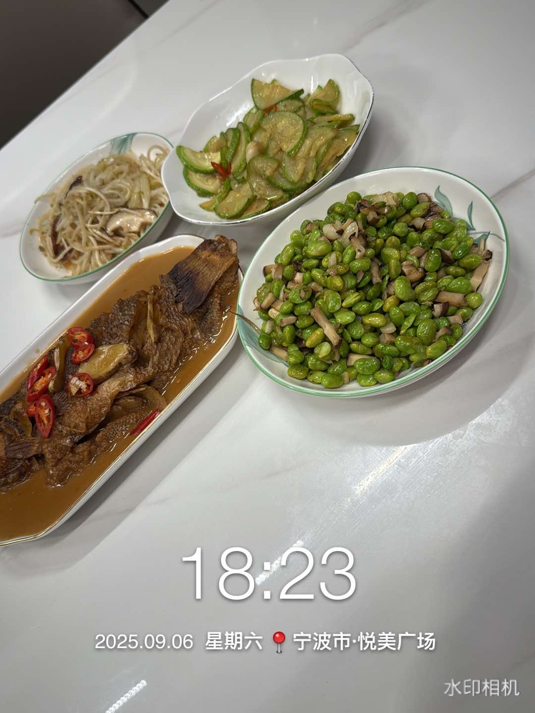 今日份晚餐,红烧鲈鱼,炒绿豆芽,炒西葫芦,炒青豆,热得我一头汗,多吃蔬菜哦