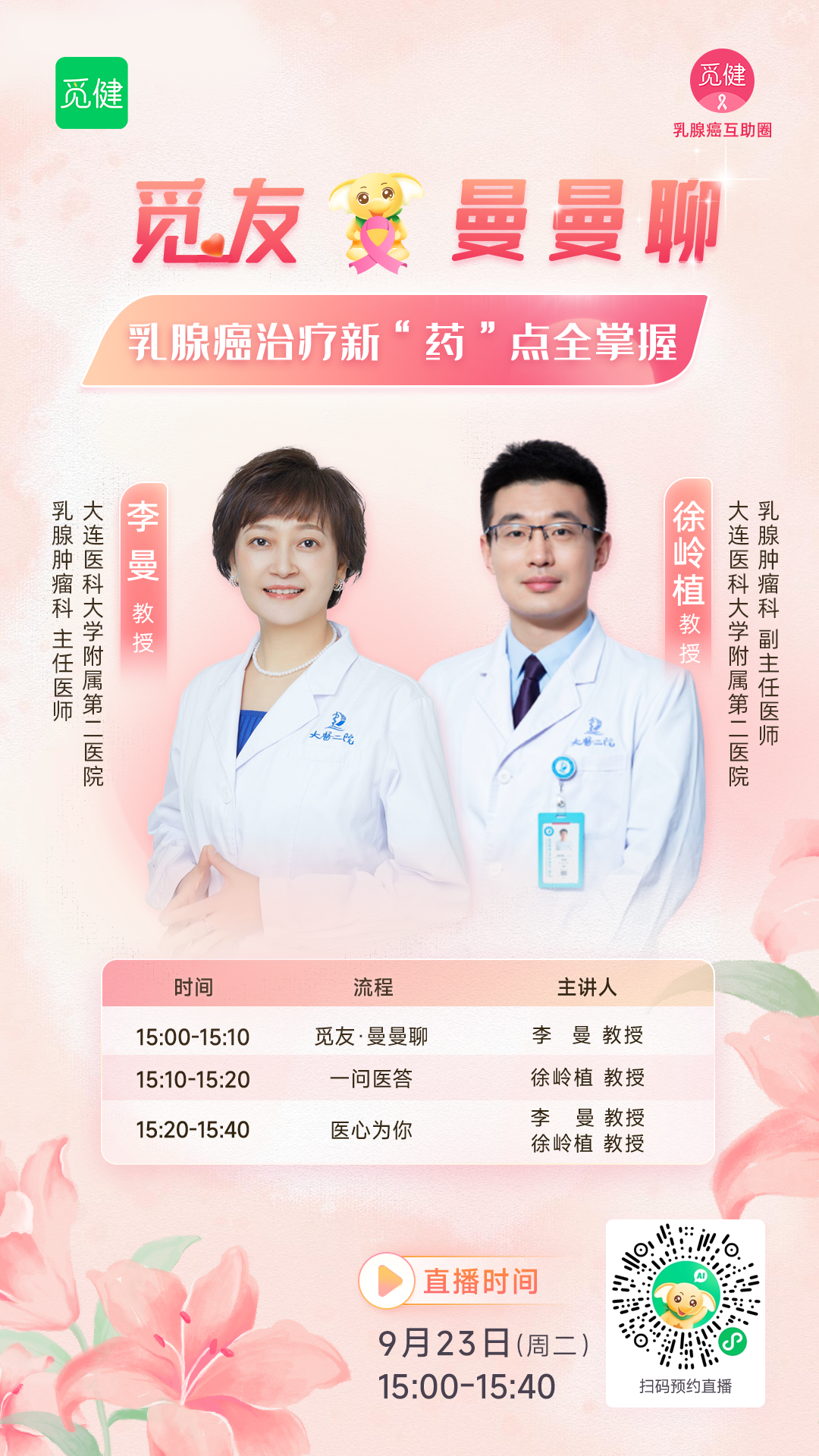 下一期【觅友·曼曼聊】将会带来主题为“乳腺癌治疗新‘药’点全掌握 ”的直播!快长按下方海报,点击识别二维码预约起来吧!
