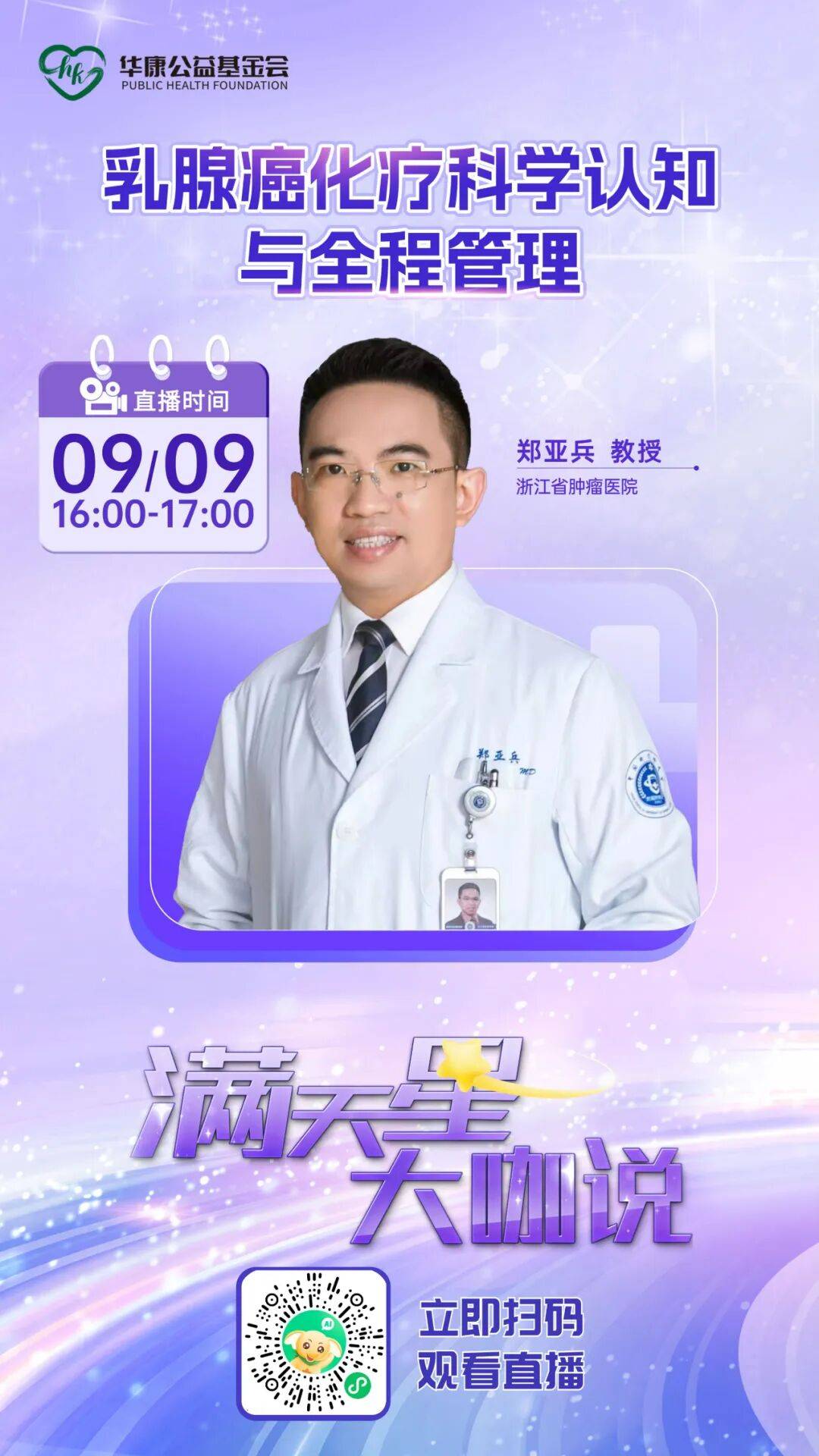 为帮助大家科学应对化疗,9月9日16:00-17:00,“满天星行动”大咖说栏目特别邀请乳腺癌治疗领域权威专家——浙江省肿瘤医院郑亚兵教授,做客直播间,深度解读“乳腺癌化疗的科学认知与全程管理”,并在线与大家互动答疑。