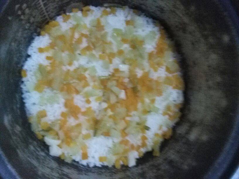 为了不炒菜把胡萝卜跟黄瓜跟饭一起煮了,而且加了大蒜,葱,鸡精,油,盐