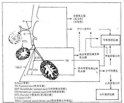 (1)非浸润性癌:包括导管内癌(癌细胞未突破导管壁基底膜)、小叶原位癌(癌细胞未突破末梢乳管或腺泡基底膜)及乳头湿疹样乳腺癌。此型属早期,预后较好。