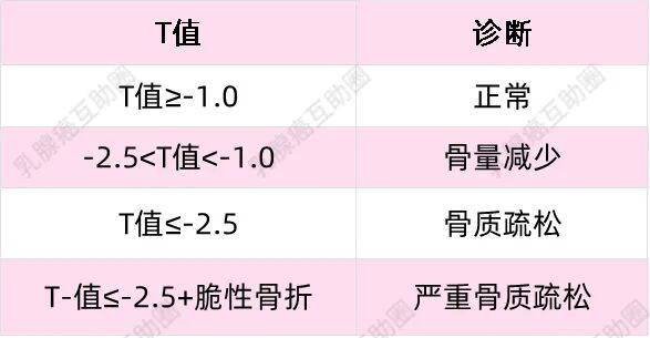 还不知道怎么检查骨量的姐妹先看这个:首先我们会到医院检查骨密度,得到一个T值,再根据T值的范围将骨量划分为以下4种,若T值≤-2.5则为骨质疏松。