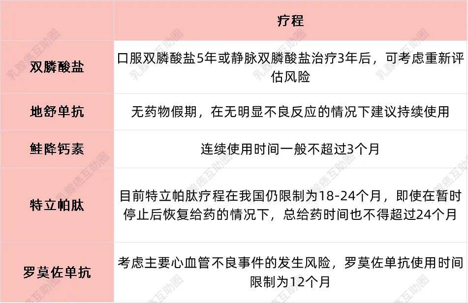 其他几种抗骨质疏松药物的使用疗程都总结在下面的表格里了,需要的姐妹自取哦!