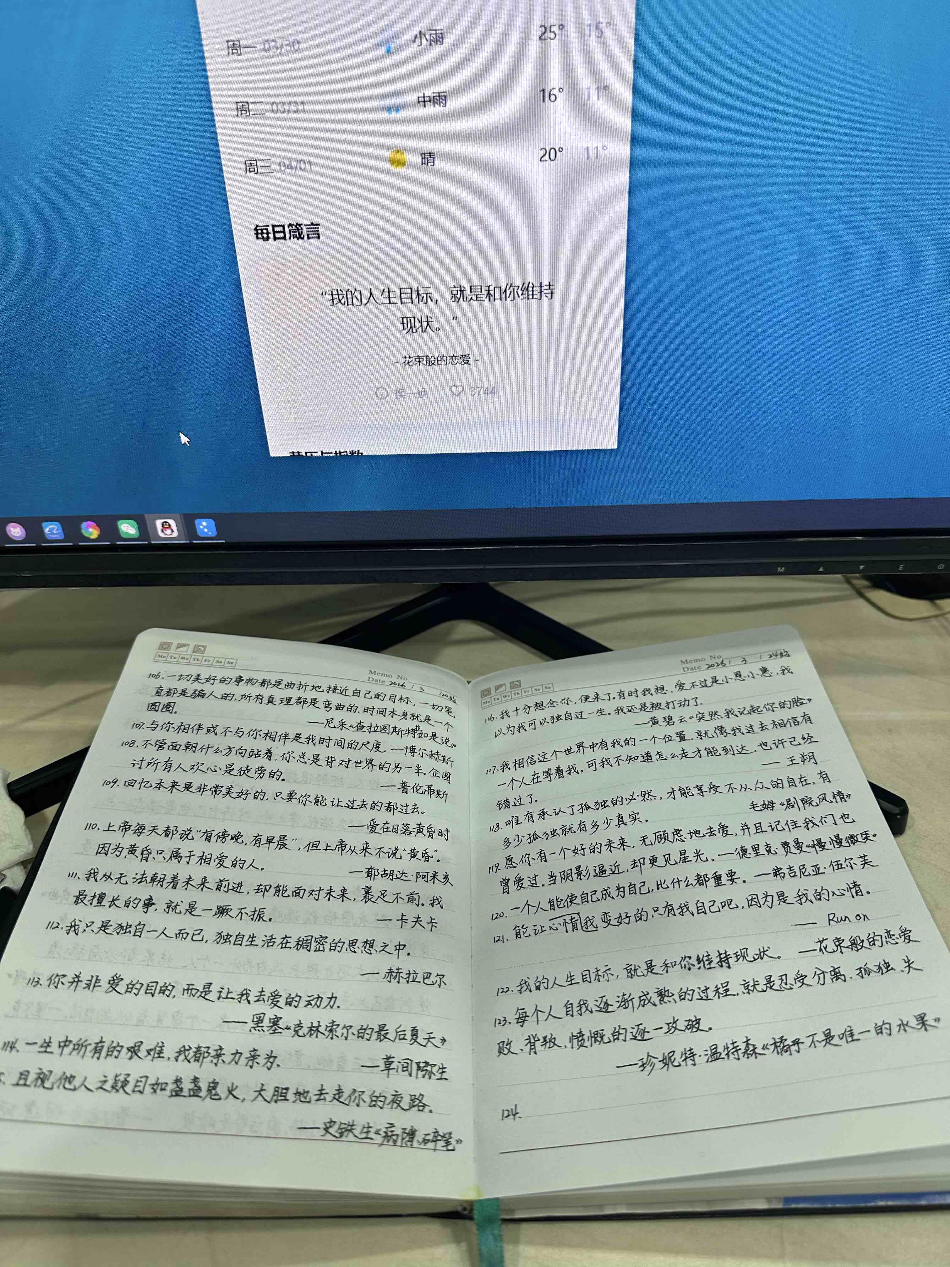 现如今,世事无常,当代人最大的问题就是“浮躁”,我想让自己静下心来。偶然间发现QQ的天气栏下拉下来有个“每日箴言”,点换一换,可以展示三句不同的句子,于是我就在每日正式工作开始前抄写三句📝,不多不少刚刚正好😄
