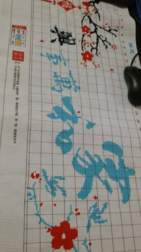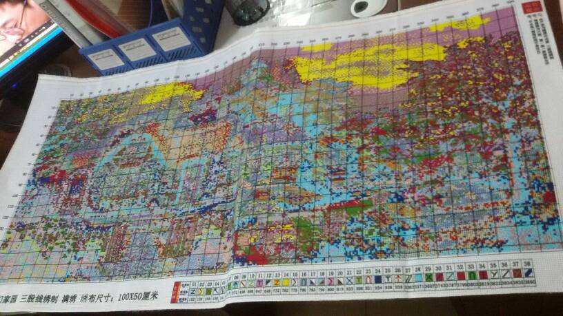 这个有印花的好绣些,我买的没印花的,还得自己用笔点的才能绣。都绣了1年多了才绣个4分一
