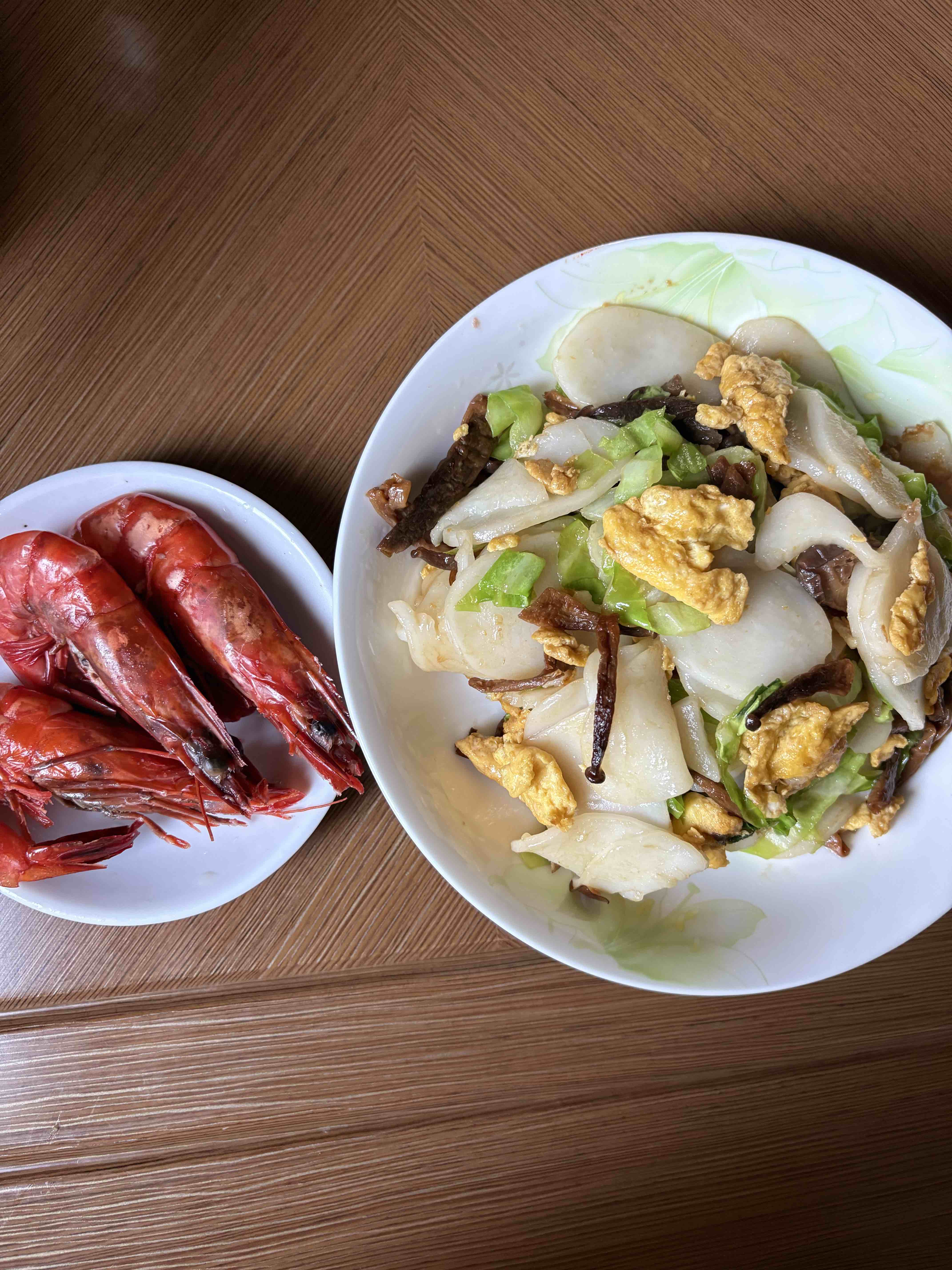 今日早餐炒年糕,松茸菇提鲜,鸡蛋嫩滑,包菜清甜,配上黑虎虾,碳水快乐直接拉满。