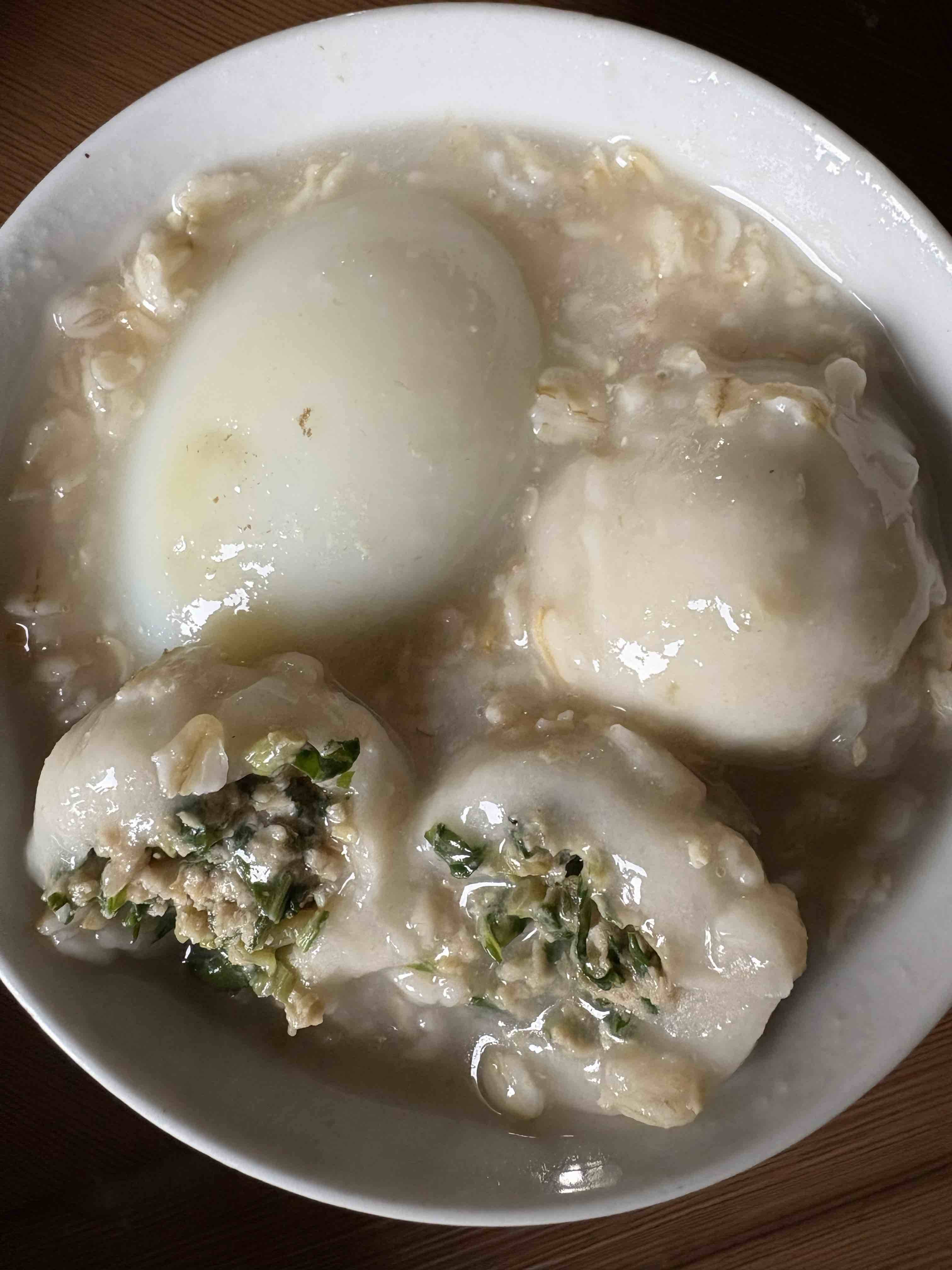 早餐开吃,马兰头菜肉团子、鹅蛋、麦片粥,清清爽爽又扎实,春天的味道一口到位。