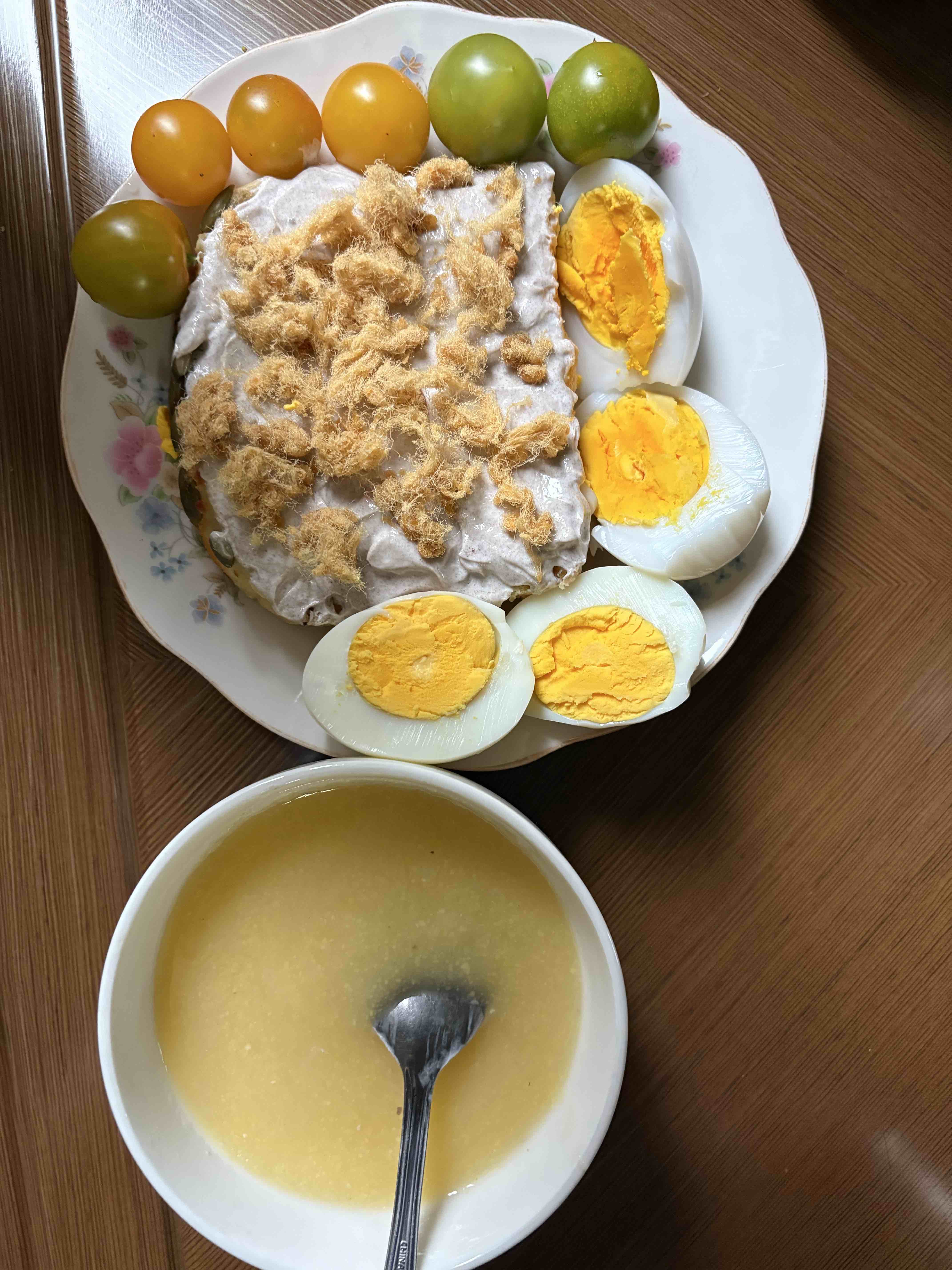 一片吐司抹上生可可粉酸奶,微苦醇香又不腻,再撒上肉松,咸甜交织超满足;搭配二个水煮蛋、补充优质蛋白,一碗温热小米粥暖胃又舒服,最后几颗彩色小番茄酸甜解腻,色彩好看、营养也超全,饱腹感强还不油腻,妥妥的健康美味早餐。