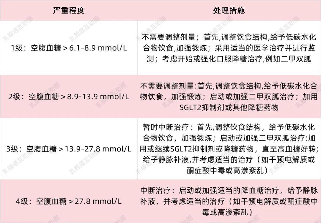 一般临床上会视严重程度来定[4]:轻中度血糖升高优先考虑改善饮食结构、口服降糖治疗(如二甲双胍等),多数情况下血糖都能得到很好的控制。只有在血糖控制困难、出现严重症状的情况下,医生才会考虑暂时延迟抗癌治疗,待血糖改善后继续用药。