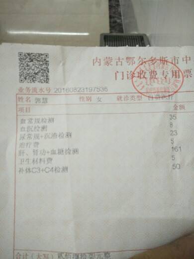 血常规18,血沉7, C3 C4测定20,肝肾功能不到100块,尿常规不到10块。