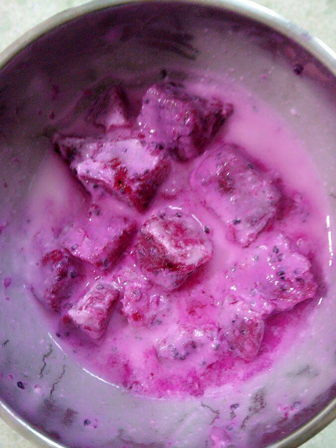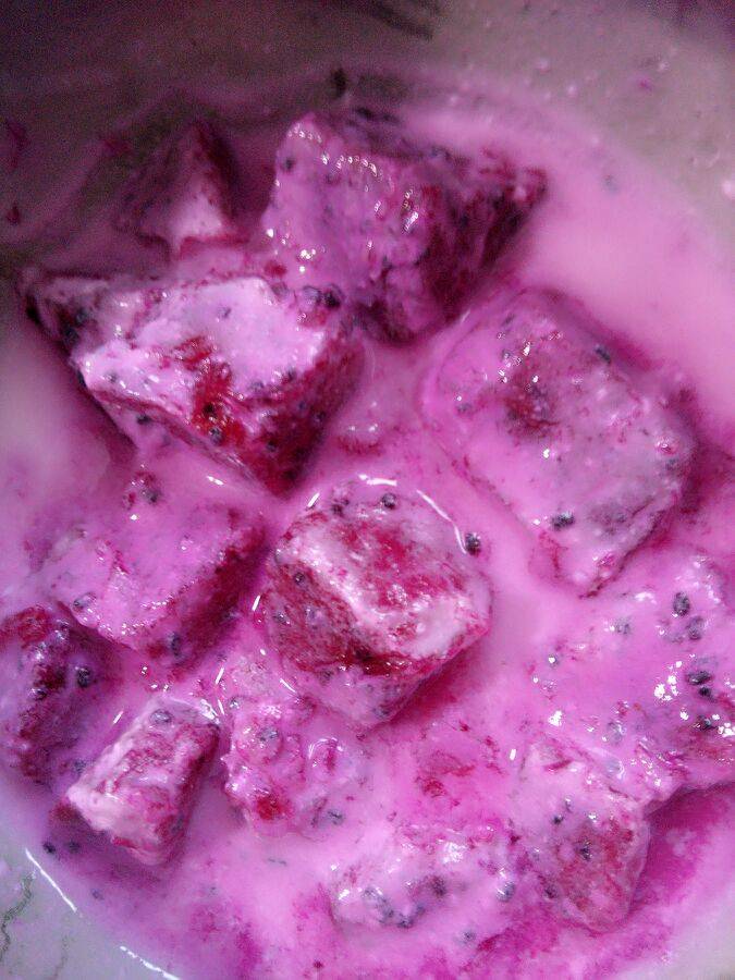火龙果去皮切块,经典原味花花牛风味酸牛奶,稠的那种,袋装的,剪开倒入拌匀,放冰箱冰一会儿,胃不好不用冰,ok了!香蕉也可。