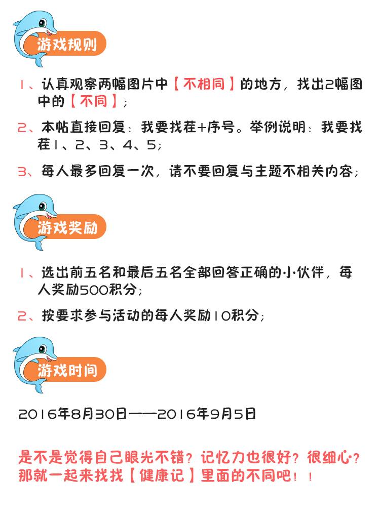 一共有十处,你答对了吗?截止到活动时间9月5日23:59:59,回答对的前五名和最后五名参与者可以获得500积分~~~