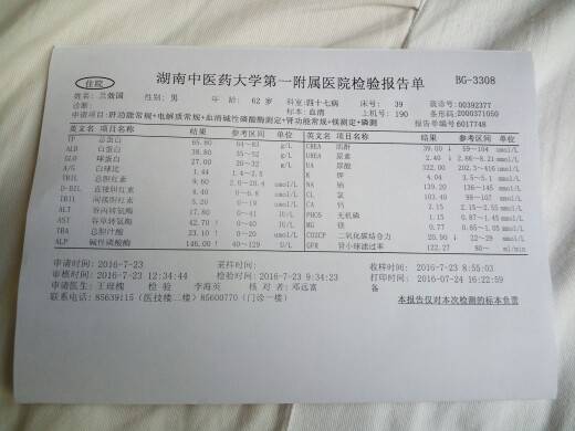这是2个月前,你爸的肝功参数还挺好的,谷草转氨酶高一点,他的胆可能有小毛病,肾功有点毛病,癌胚抗原怎样?甲胎蛋白怎样?病毒怎样?病毒抗体定量怎样?你爸目前上厕所蹲起都要注意,不能摔倒。