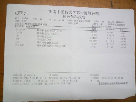 好的,检验单你问问看病的医生就可知道,CT要及时作,目前 ,不要再作手术,尤其是化疗,放疗不要作。最近要吃葡萄。