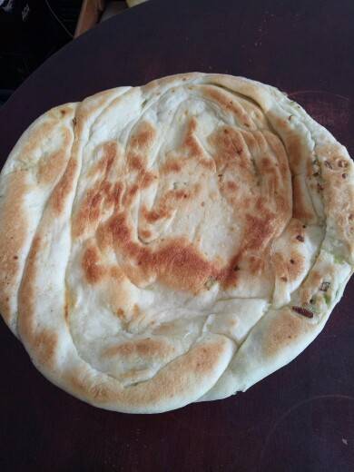 一碗面粉,放3_5克酵母粉,用30_40度的水和面,醒半小时,然后就擀面皮,放入花椒面,盐,葱花,然后卷上后再擀成饼就可以烙饼了