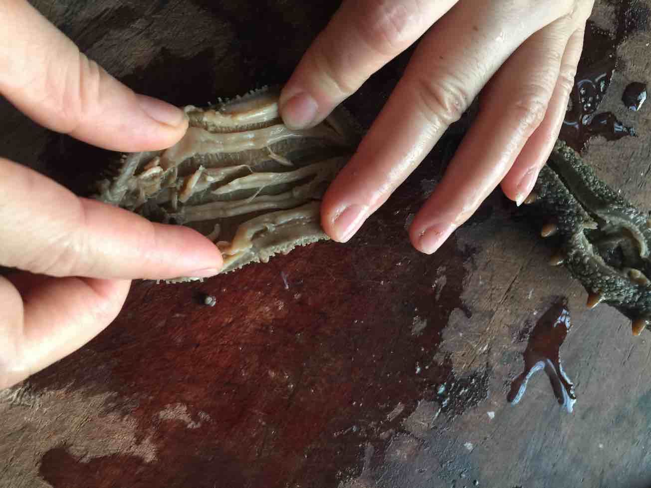 只需要把沙嘴(也有人认为是牙齿)去掉就行了,那个白色的筋很有营养,千万不能去掉,在清理过程中,将白色的筋用剪刀横切几刀,可使海参泡发的更大一些!