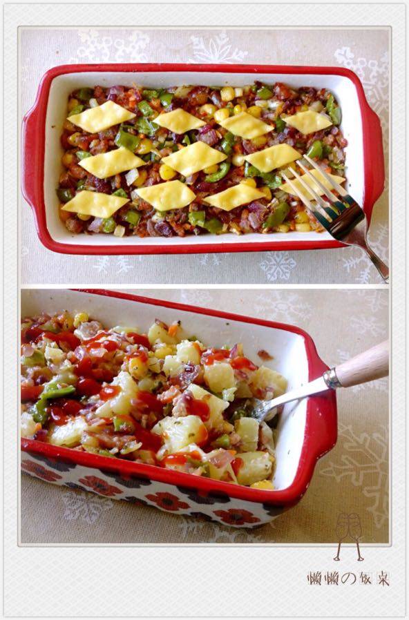 也不知道该叫什么,就是土豆先蒸熟,切块放碗底,上面放炒过的蔬菜,最上面放奶酪的,烤箱烤到奶酪融化就好了,拌匀后才觉得有点腻,又放了番茄酱;没做主食,土豆当主食了