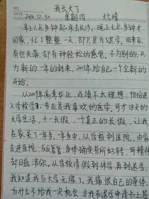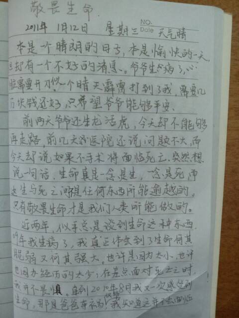 因为生病,我的情绪有时莫名的低落,对未来没有希望。因为自卑,不想与人诉说,只能独自一人流泪。所以我的日常之一就是写日记。写日记可以抒发自己的情绪,激励自己看开点,不幸已经降临到自己身上,不要让自己变得更加不幸。