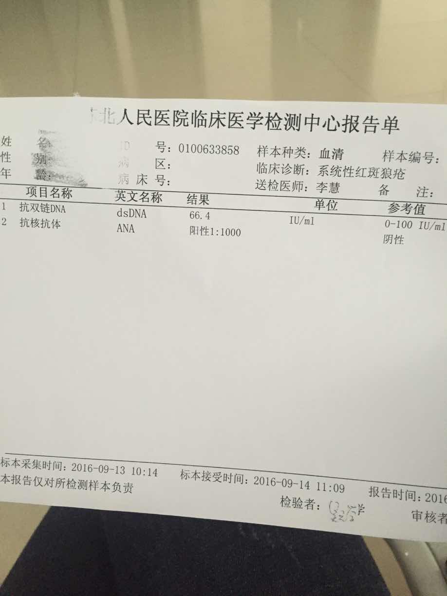 这几天不知道怎么,腿上无缘无故这样了……以前也有点,但没这么厉害!有病友这样的吗?是什么原因会导致发青发紫呢……最近一段时间情绪有点不好,还失眠。。!前几天检查的结果化验单好像还算正常!上图给大家看下。。。滴度1:1000算高了。。有病情稳定滴度也高的吗?我现在只吃激素和该片。。