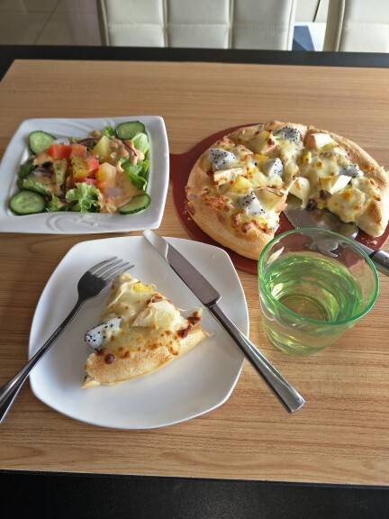 。这时已经中午了。几个医生也没吃饭,好在修好了机器。我终于完成了今天的治疗。出了医院肚子叫了。看到一家披萨店,犒劳自己吃次披萨,一个人的披萨午餐