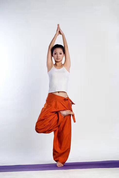 1、弯右膝,吸气,手抓住右脚踝,身体向上伸展,呼气右脚尖向下,放稳在左大腿根上(也可以踩在小腿上)
