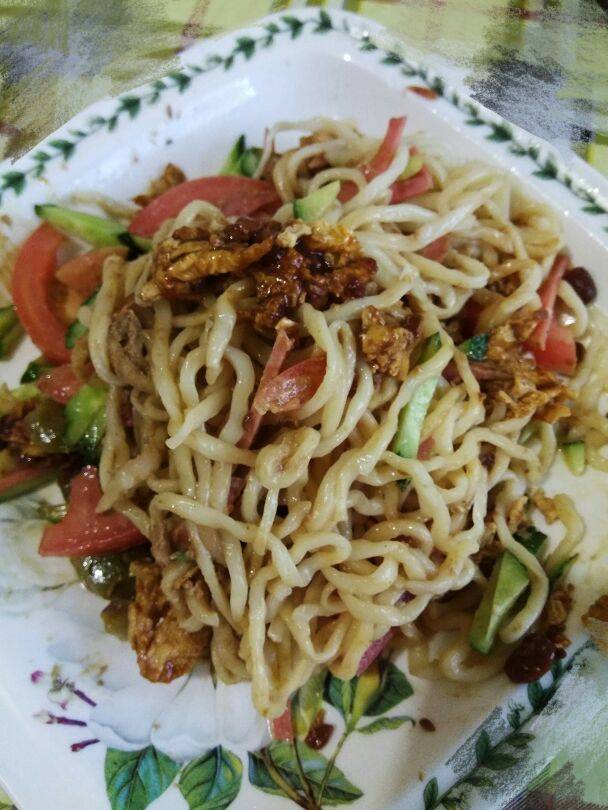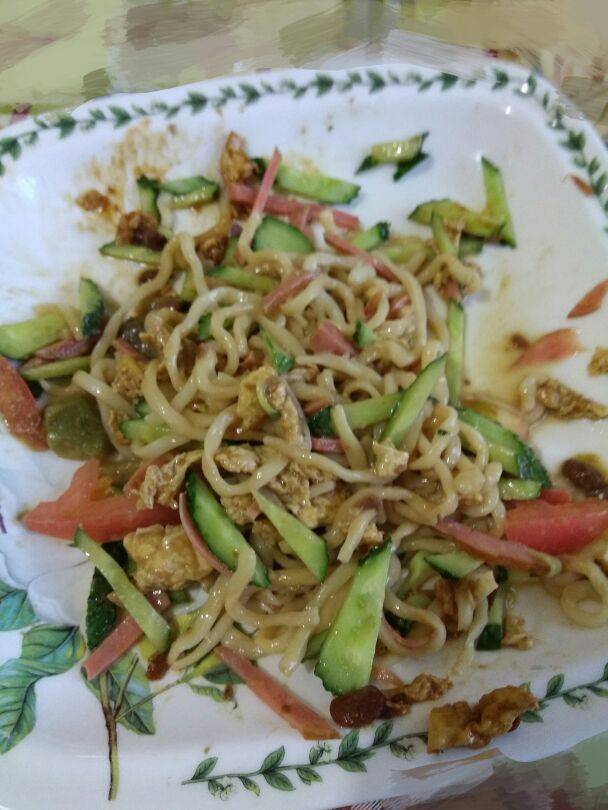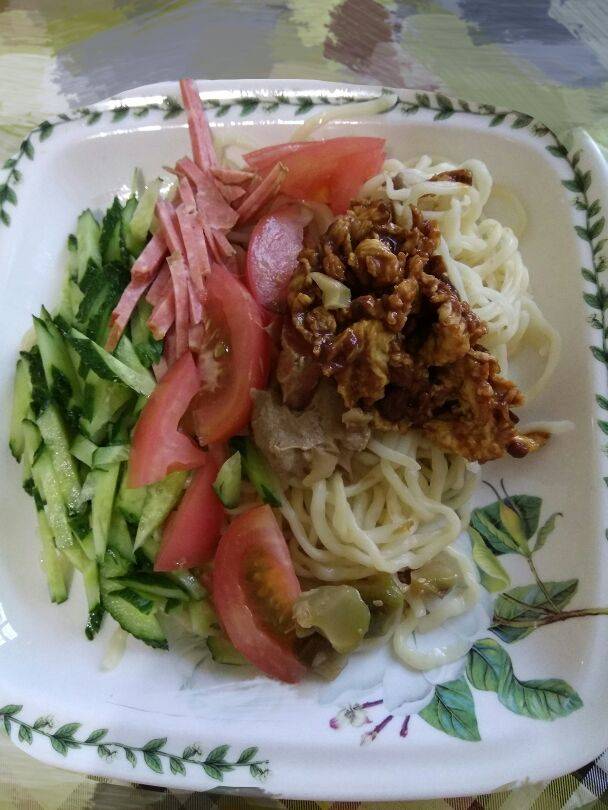 今天晚饭又是一个人吃,于是乎决定吃点简单省事又不失营养的拌面,切黄瓜切西红柿切火腿,调麻酱,炸鸡蛋酱,分分钟搞定,分分钟吃完,这战斗力还可以吧