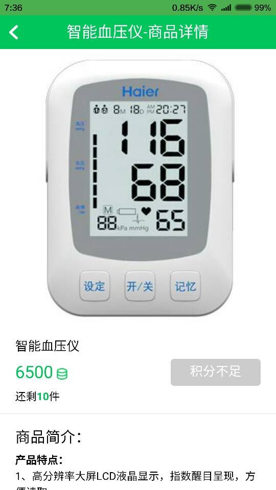 本来想兑换一个血压计的可是积分却一直在上涨,刚开始的4200积分到后来的4800积分,现在竟然到了6500积分,我才三千多,本来还说终于快攒够了,可是又涨了这么多,我估计我攒不到了