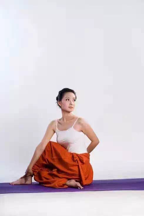 1.吸气,将右边小腿收向内,让右脚底挨近左边大腿的内侧。呼气,左脚跨过右膝,脚掌平放地上。