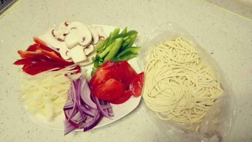 简单好吃的炒面,自己随便搭配喜欢的蔬菜。绝对打败夜市的炒面。 1 . 红椒、绿椒、土豆丝、洋葱丝、西红柿,蘑菇切丝准备好。 2 . 里脊肉一碗,放上葱花和味极鲜拌均匀腌一会儿。 3 . 上锅烧油,切一瓣大蒜炒香,放肉炒熟后放蔬菜, 4 . 买这种粗面条(压面条哪里有卖)煮熟后放到凉开水盆里,不要煮的太软,炒出来就不好吃,也不要太硬。把面条放到炒好的菜里,放上盐,酱油,耗油,来回翻炒,捣几下把面条捣断就行了。翻炒几下就出锅了。放上醋和油泼辣椒,一人一盘好好吃呦!(我自己认为西红柿和洋葱是必须放的提味,红椒绿椒提色有营养,)简单吧!喜欢吃面食的姐妹试试吧!