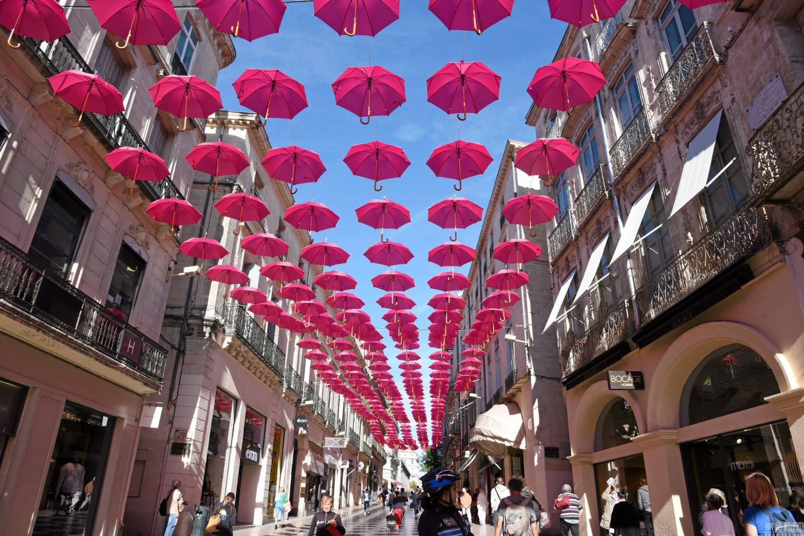 当地时间2016年10月4日,法国蒙彼利埃,当地街头悬挂粉色雨伞纪念乳腺癌宣传月。