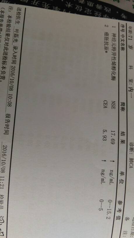 母亲是肺腺癌,纵隔肺门有淋巴转移,8月初肿瘤为38*27,采取培美加奈达泊化疗两次,昨天复查肿瘤减小到28*26,但是颈部左锁见多个淋巴结,最大7*5mm,边清,不知道是不是颈部淋巴转移了??另外CEA 从4.3上涨到5.93,NSE从10上涨到17.69,这是不是不好?