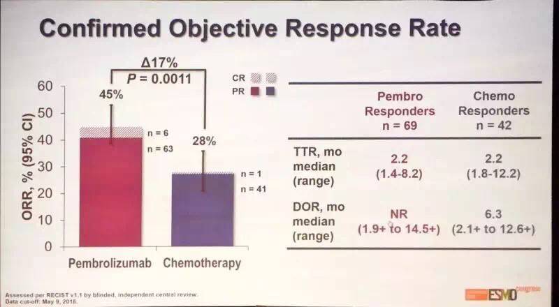 Pembrolizumab组还显示出高总响应率(45% VS 28%),较长的有效时间和更低的毒副作用。
