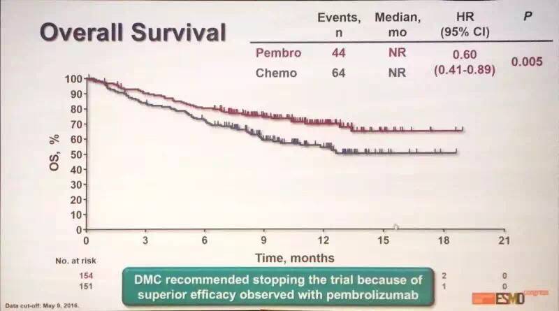 而Reck教授牵头的这项KEYNOTE-024试验,是首次将Pembrolizumab用于PD-L1高表达的NSCLC一线治疗对比化疗疗效的研究。