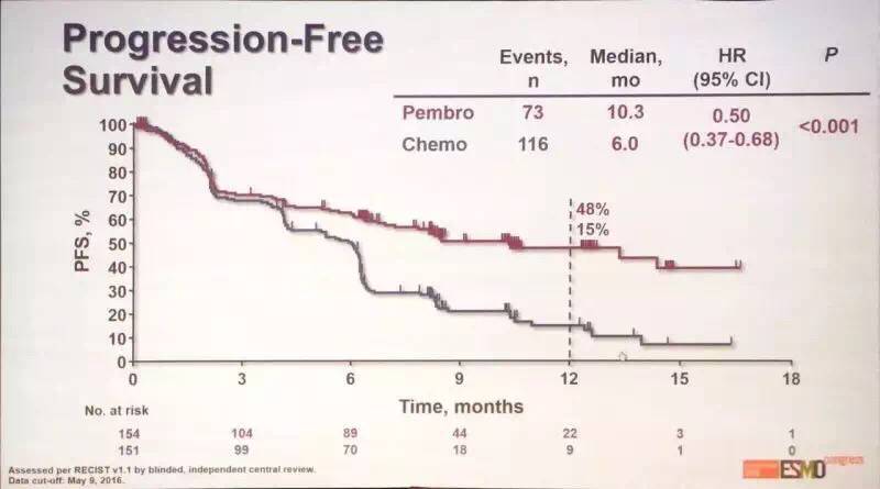 主要研究终点为无进展生存期(PFS)。结果显示,Pembrolizumab较化疗组延长了4个月的PFS。(10.3月VS 6.0月,HR=0.5)。