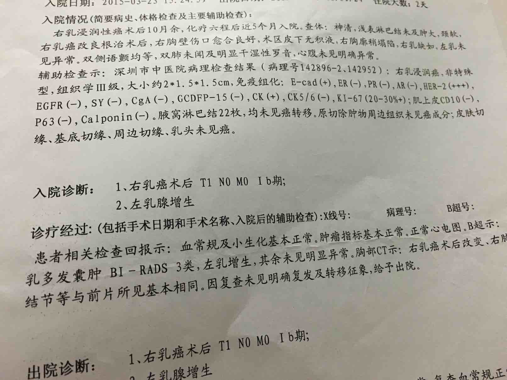 你看你的单子有一个出院诊段是一期,是非常好的。但her2过表达打靶向