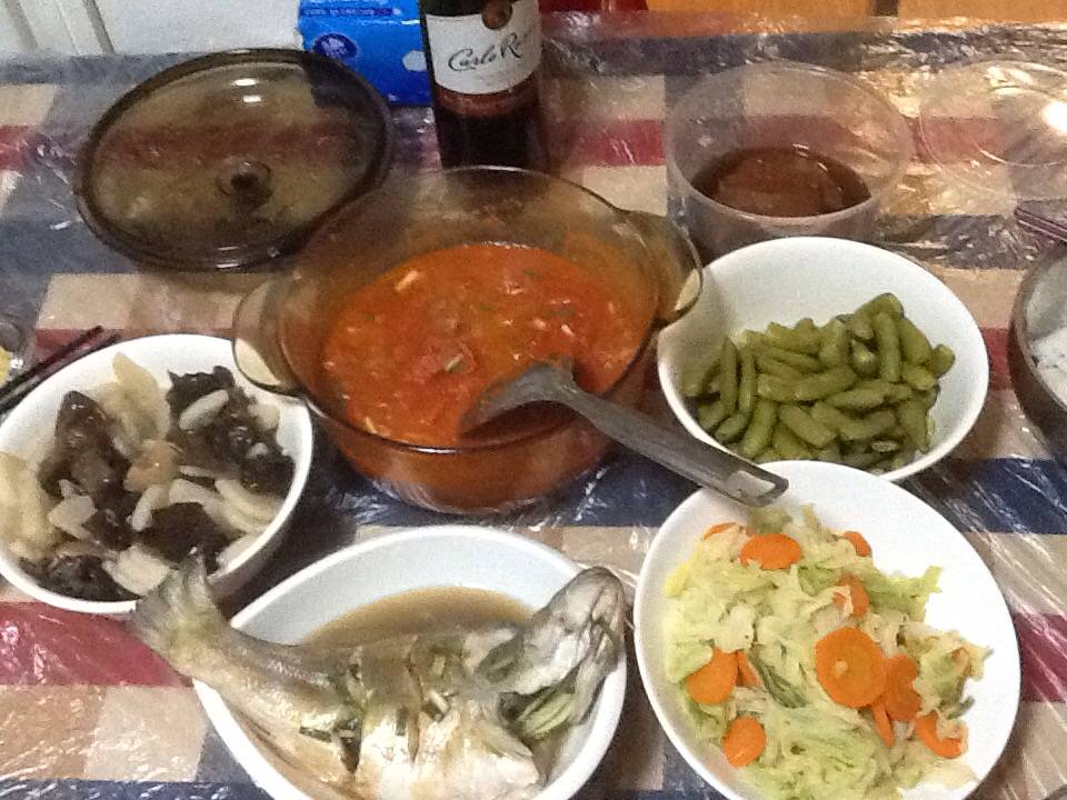 番茄牛腩汤,盐水毛豆,山药香菇木耳,清真鲈鱼,糖藕,卷心菜胡萝