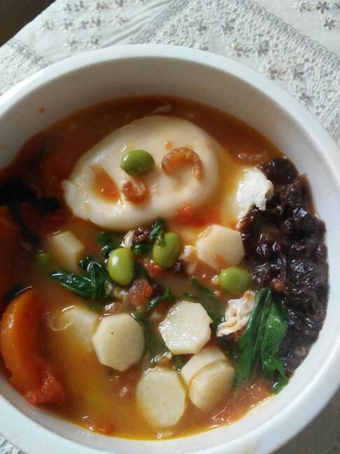 ,面条的配菜是小青菜,青豆,紫菜,海米,胡萝卜,山药,还给自己荷包了一个大鸭蛋,营养足足哦