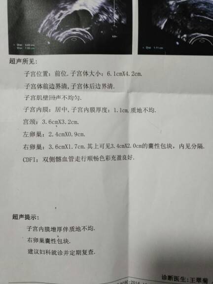其他都正常,只是子宫内膜1.1cm,右侧卵巢囊肿。今天没有挂上乳腺门诊的号,不知道大家有知道这个结果应该继续观察还是怎样呢?