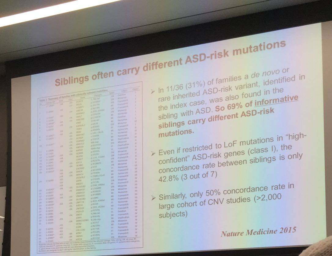 此外,在自闭症谱系家庭里,兄弟姐妹同患自闭症的概率是18%。即使哥哥有自闭症而妹妹没有,妹妹基因组内存在哥哥变异基因的概率是69%。